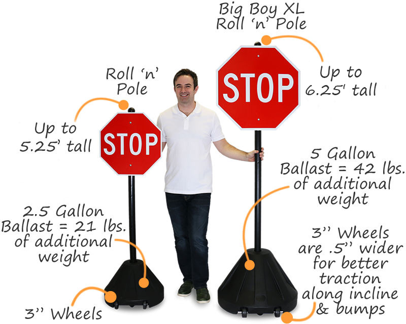• • Won't tip over. Tip 'n' Roll and Roll 'n' Pole bases have a 2.5 gallon ballast, while our new Big Boy XL Roll 'n' Pole holds a whopping 5 gallons of additional weight. Cast Iron Bases weigh up to 37 lbs!