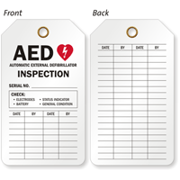 An AED tag includes columns or boxes to record the date of each inspection (usually monthly) and the technician's initials. It also often has space to note the battery and electrode pad expiration dates. Check out our customizable custom inspection tags.
