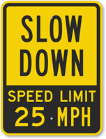Save lives fast! Slow Down signs prevent accidents daily. Choose from a huge selection to put near a construction site, school, blind corner, hill, etc. Quickly grab attention with a Slow sign.