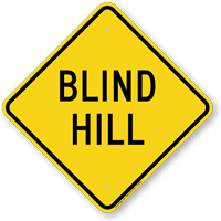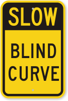 Slow down! Blind corner is ahead. Blind corners exist because of a curve, landscaping, parking cars or a hill. In all cases, a blind corner sign gives everyone advanced warning of the potential for a vehicle to suddenly appear.