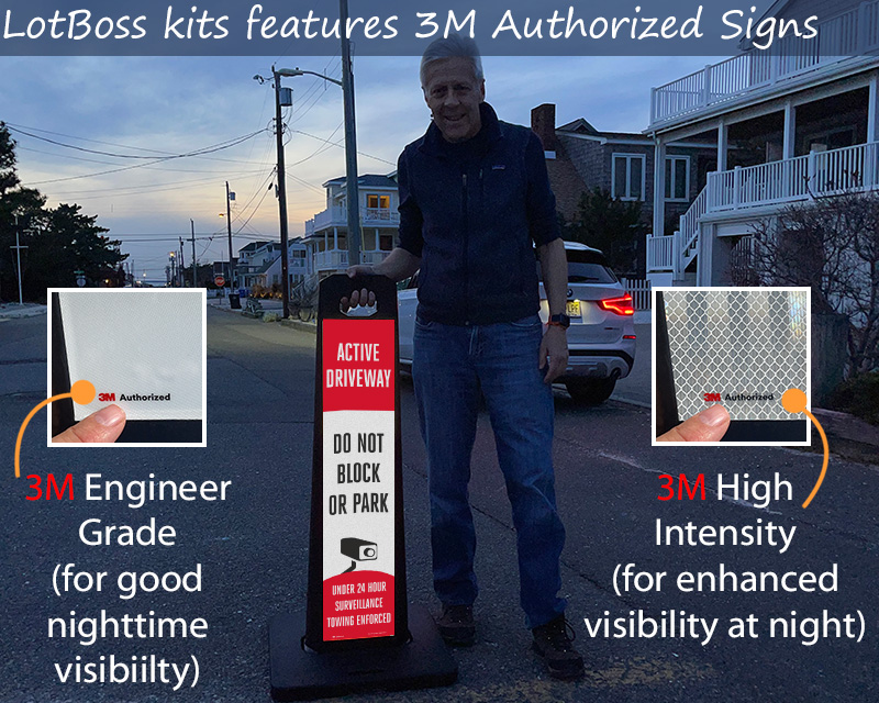 Posting a clearly visible "Do Not Block Driveway" sign is the most effective first step, and our do not block driveway LotBoss portable sign kit is a great option for properties that need a freestanding, highly visible barrier sign that can be repositioned as needed without any drilling or tools.