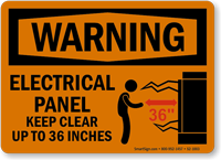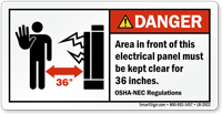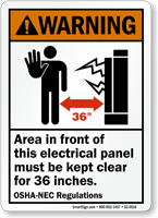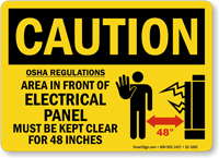 • • Do Not Block Electrical Panel Signs, Electrical Panel Keep Clear Signs - OSHA section 1926.403 clearly indicates to keep a minimum clearance of 30" to 48" around the electrical panel.