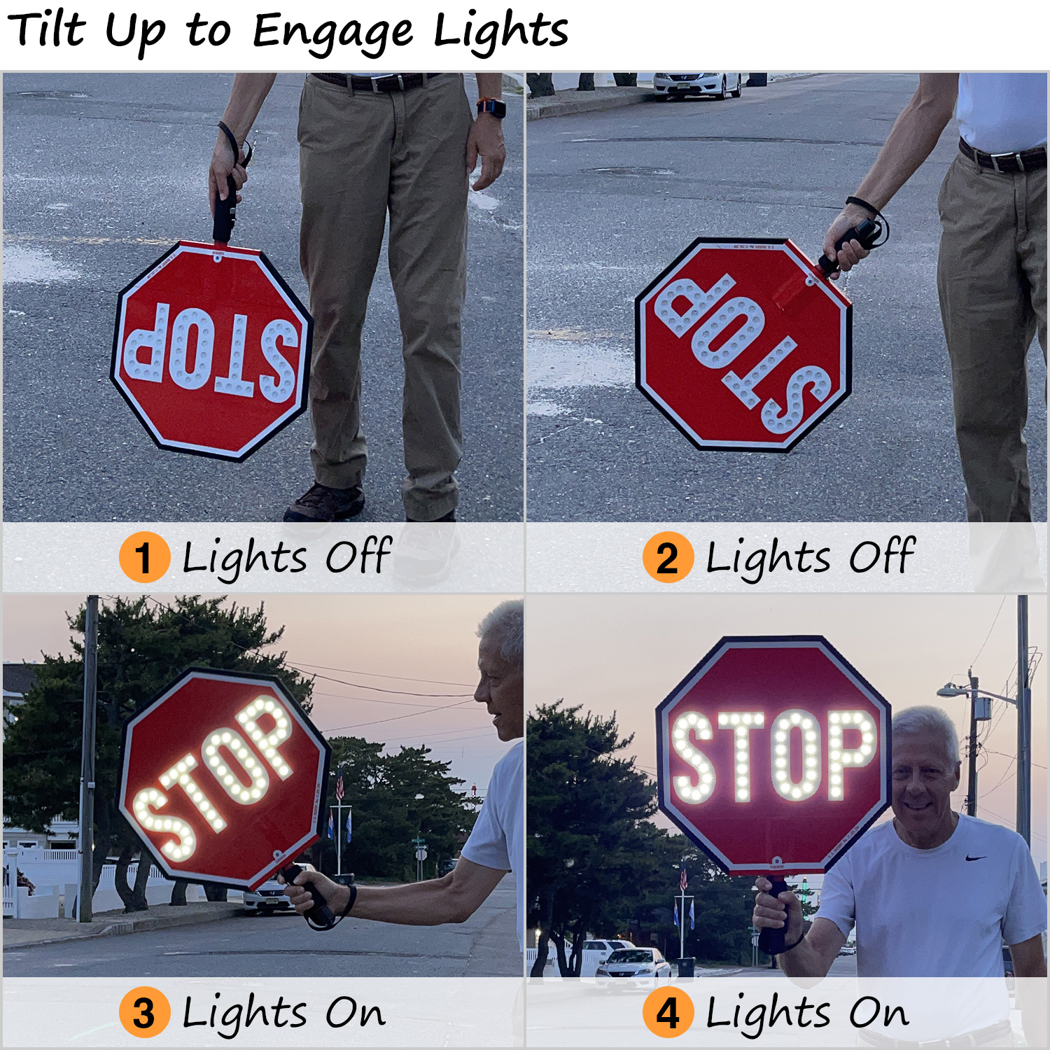 - Tilt paddle to turn off the lights. Simply point the sign towards the ground and the LED lights turn off. Raise the sign back to the upright position to turn on the LED lights. This allows you to save battery without the annoyance of turning the sign on and off.