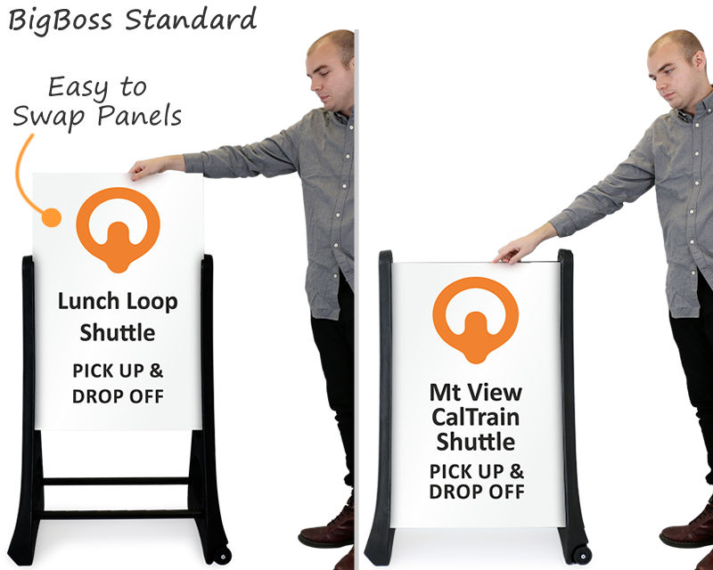 • BigBoss Standard signs have curved slide-in slot for the panels, that can be easily replaced. Frame does not fold.