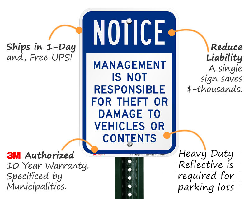 You should mount a liability warning sign at every major entrance to your parking lot or garage. Ensuring these signs are highly visible before a driver parks guarantees they acknowledge the property rules and your lack of liability for potential vehicle damage.