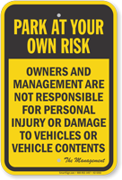 A simple sign can save you and your drivers many thousands of dollars. Alert drivers to parking risks in unsafe or unsecured areas. Use park at your own risk signs to prevent accidents, explain damages, and reduce your liability. Use for hotel, church or store parking lots. Protect against theft, careless drivers, snow… even foul balls.