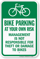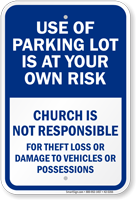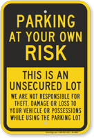 A simple sign can save you and your drivers many thousands of dollars. Alert drivers to parking risks in unsafe or unsecured areas. Use park at your own risk signs to prevent accidents, explain damages, and reduce your liability. Use for hotel, church or store parking lots. Protect against theft, careless drivers, snow… even foul balls.