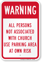 A simple sign can save you and your drivers many thousands of dollars. Alert drivers to parking risks in unsafe or unsecured areas. Use park at your own risk signs to prevent accidents, explain damages, and reduce your liability. Use for hotel, church or store parking lots. Protect against theft, careless drivers, snow… even foul balls.