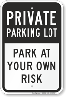 A simple sign can save you and your drivers many thousands of dollars. Alert drivers to parking risks in unsafe or unsecured areas. Use park at your own risk signs to prevent accidents, explain damages, and reduce your liability. Use for hotel, church or store parking lots. Protect against theft, careless drivers, snow… even foul balls.