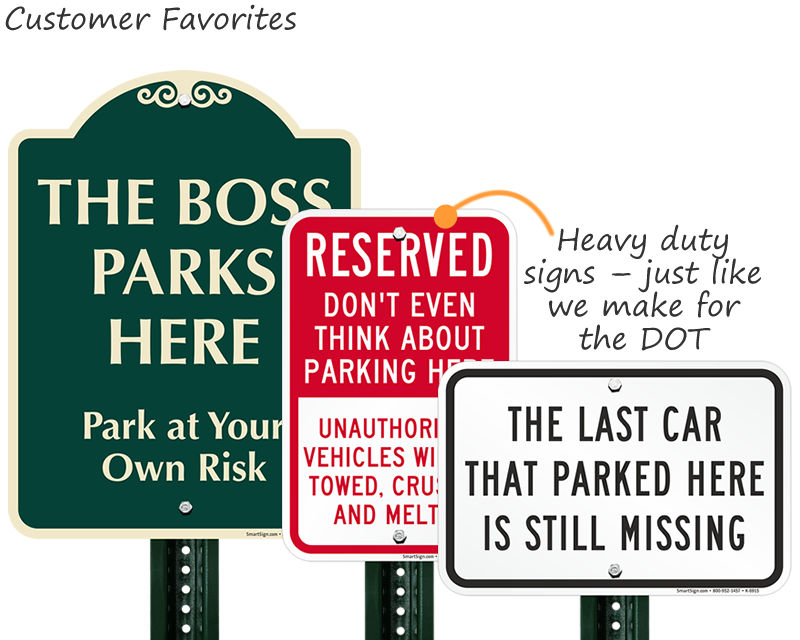 We offer a wide selection of funny parking signs for homes, offices, garages, and businesses featuring witty messages about reserved spots, unauthorized parkers, and more. They are made from the same durable aluminum as standard signs so they hold up outdoors.