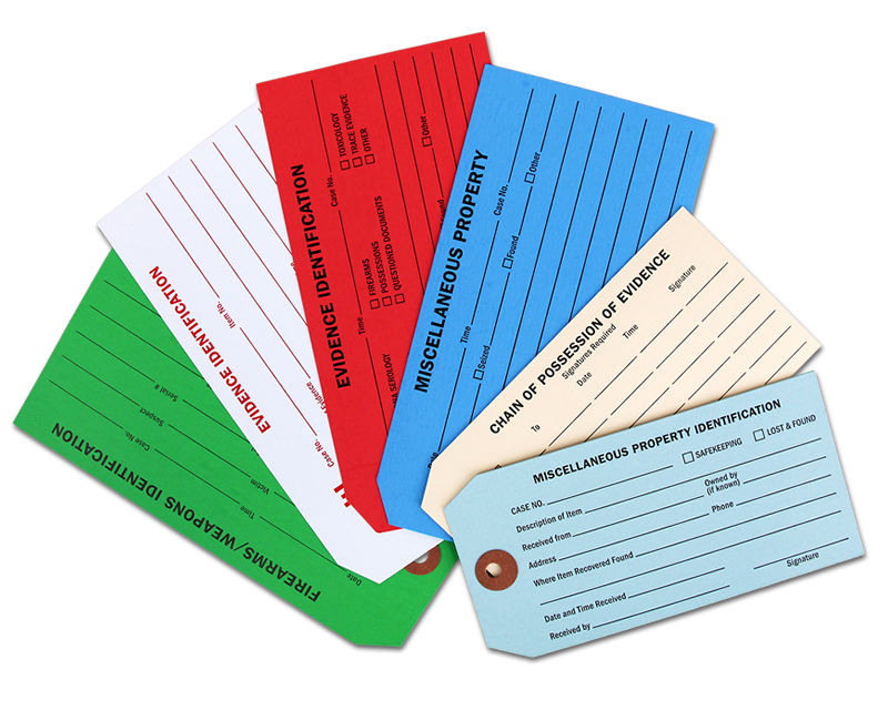 • • Our Police Evidence Tags are the premier means for identification at crime scenes, manufactured in small, manageable sizes and a variety of colors, from standard and neutral to bright and eye-catching.