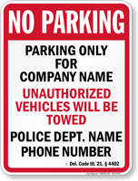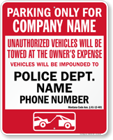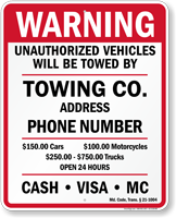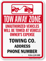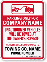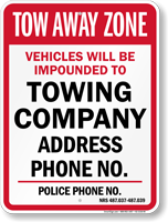 • • Find compliant tow away signs below. Local laws may vary, so we recommend you check with your local authorities before placing an order.