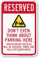 Really irritated with people parking illegally on your private property? Take your frustration out with our edgy tow away signs. Signs don’t leave any room for ambiguity. Possible violators should know illegal cars will be towed… or worse! Our pre-printed messages are spearheaded and strongly makes your point clear.